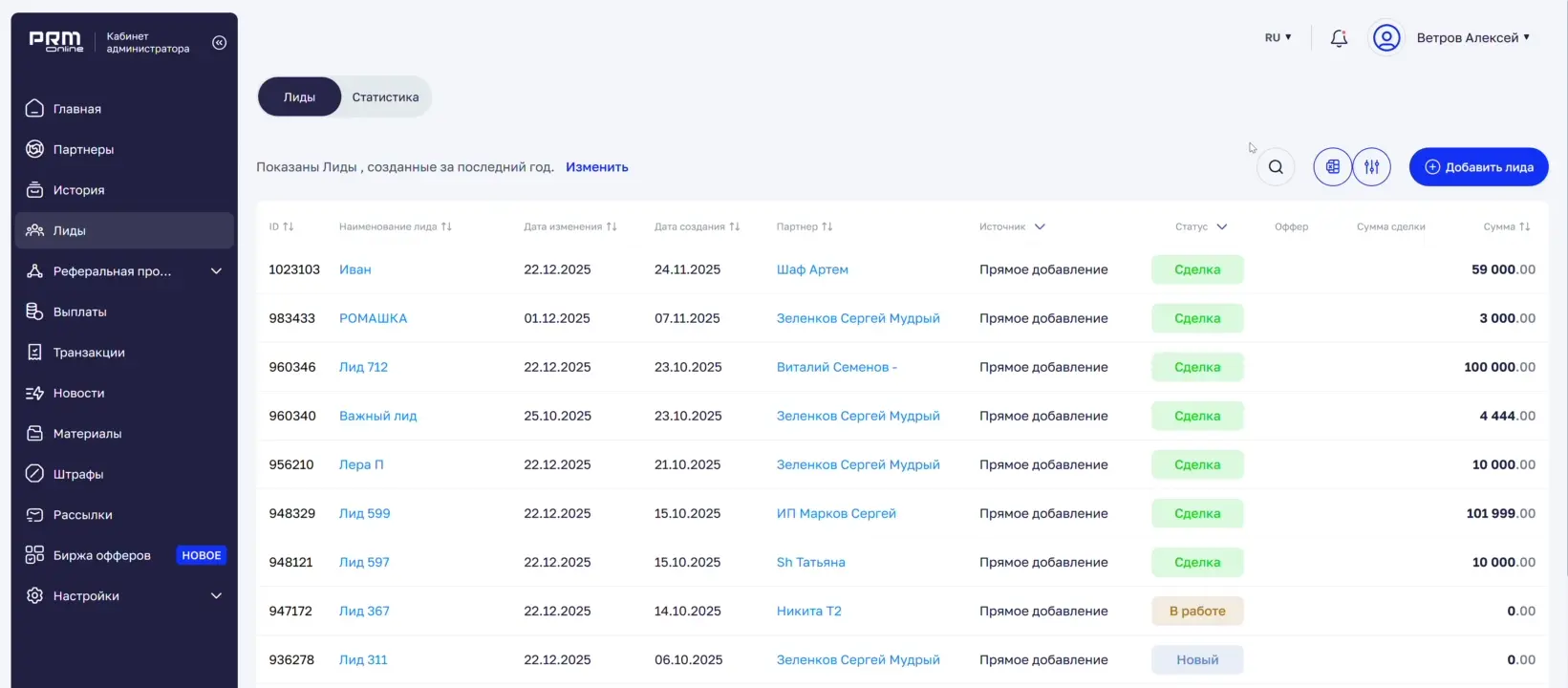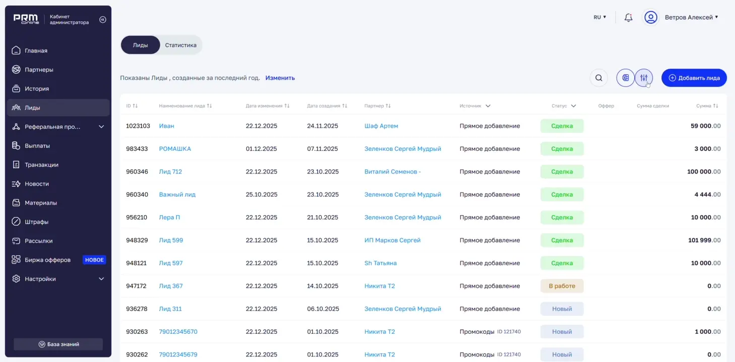 Лиды: Работа с лидами: управление, добавление, работа с начислениями