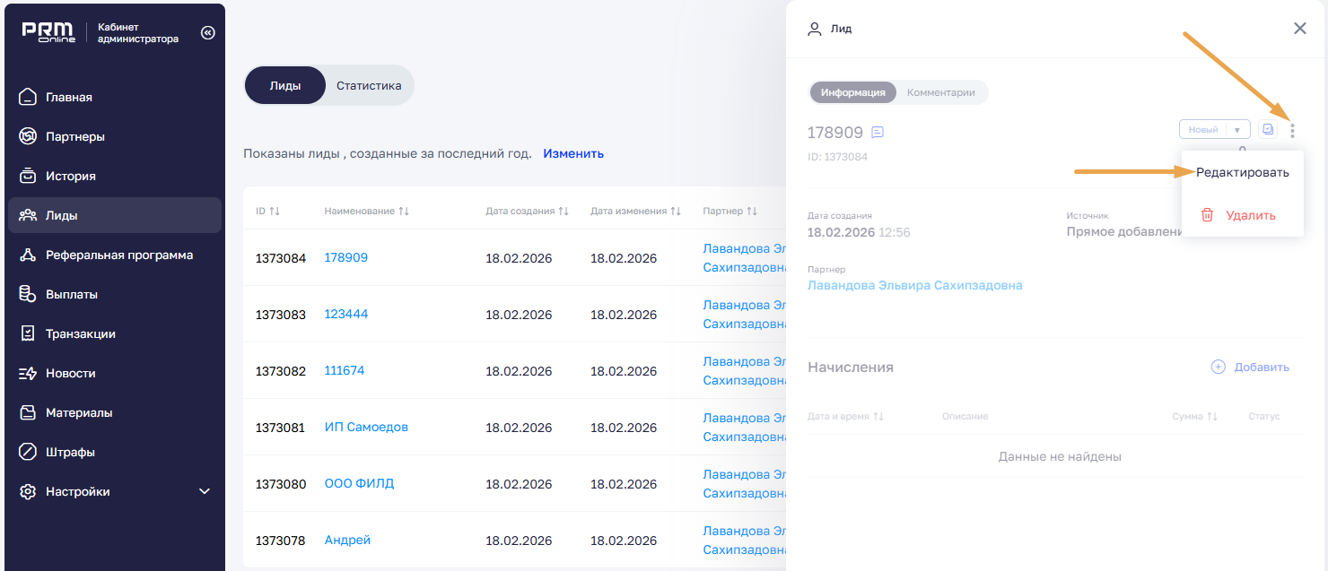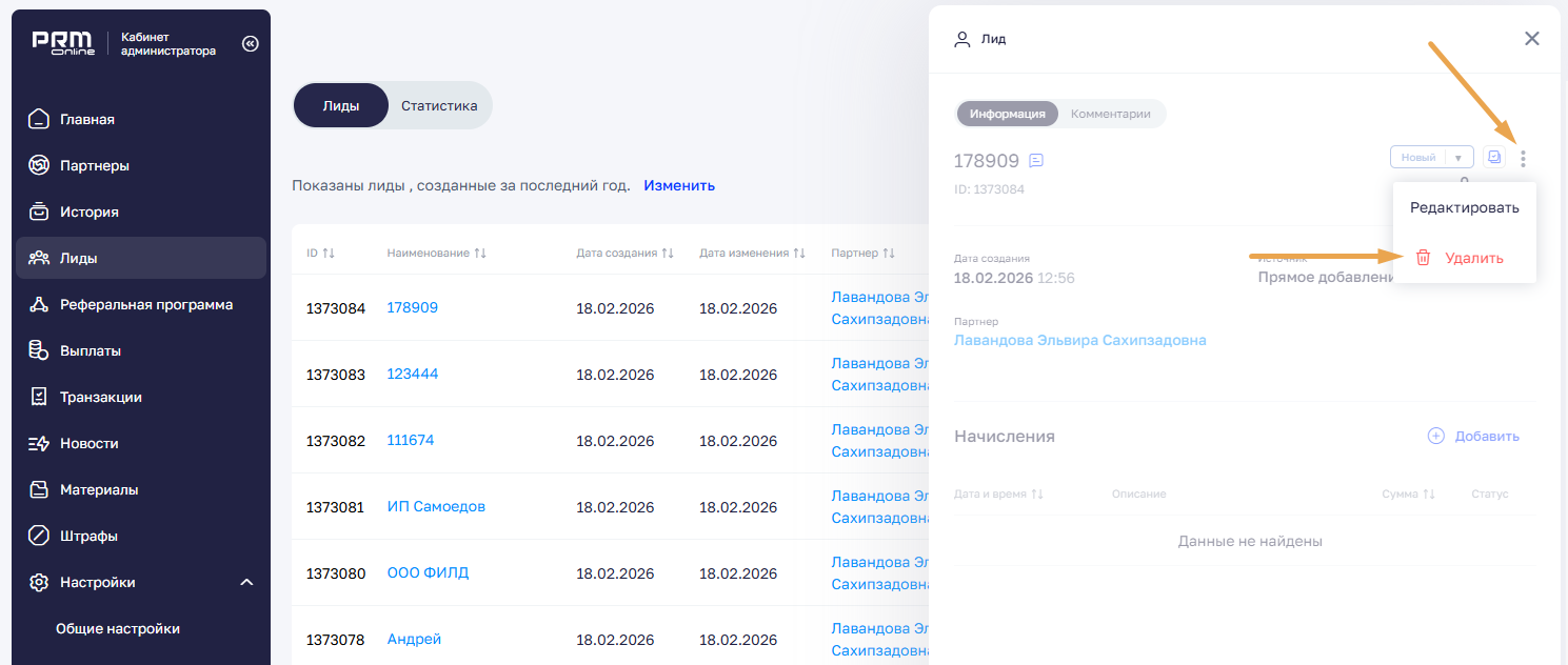 Чтобы удалить лида из системы, откройте меню «•••» и выберите «Удалить». После удаления лид перестанет отображаться и у администратора, и у партнера.