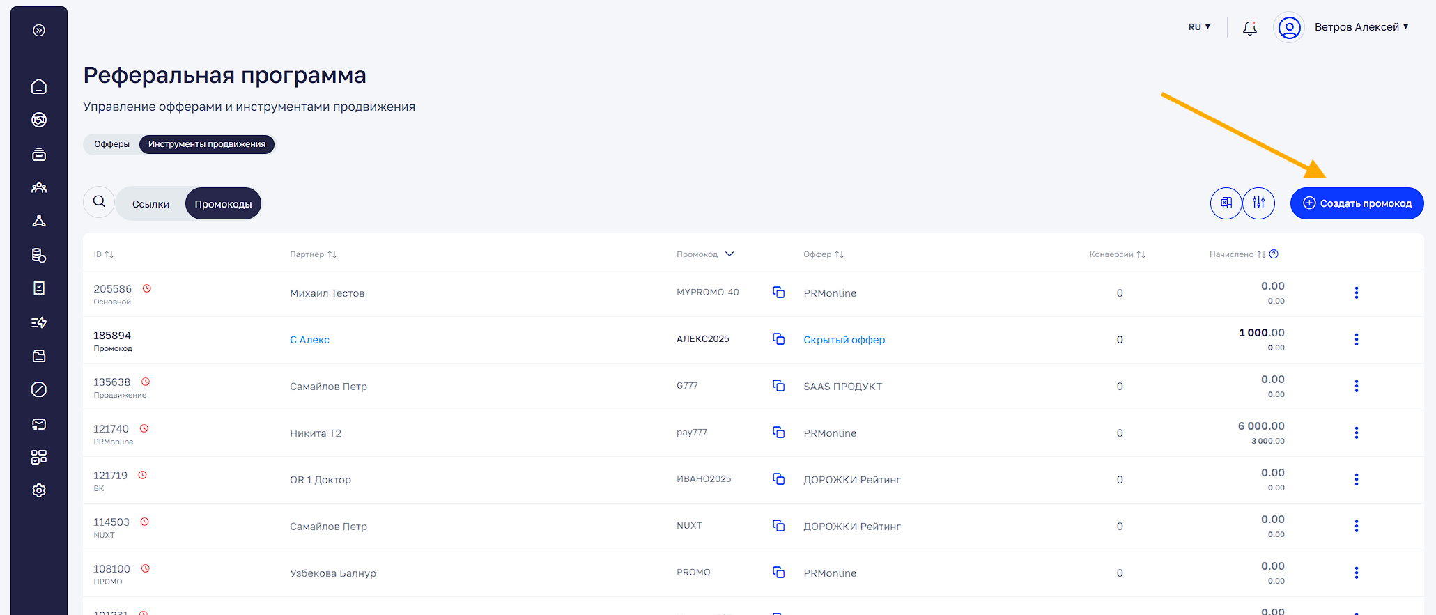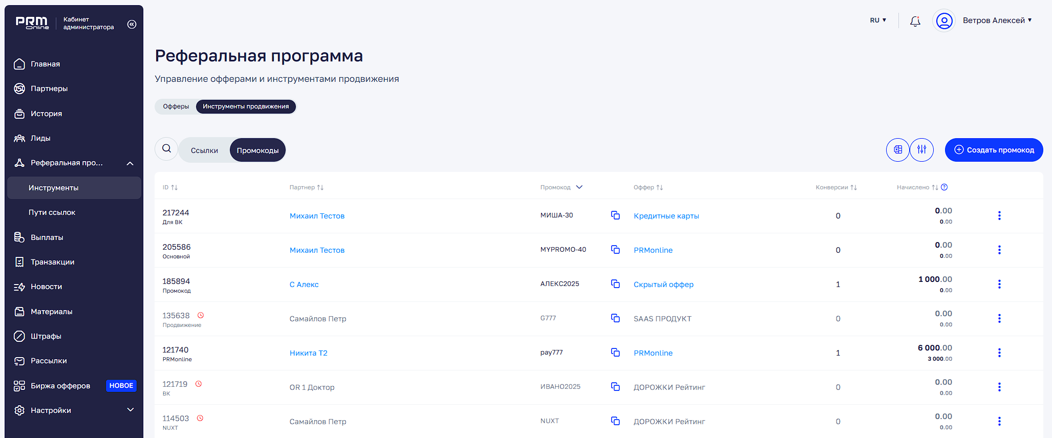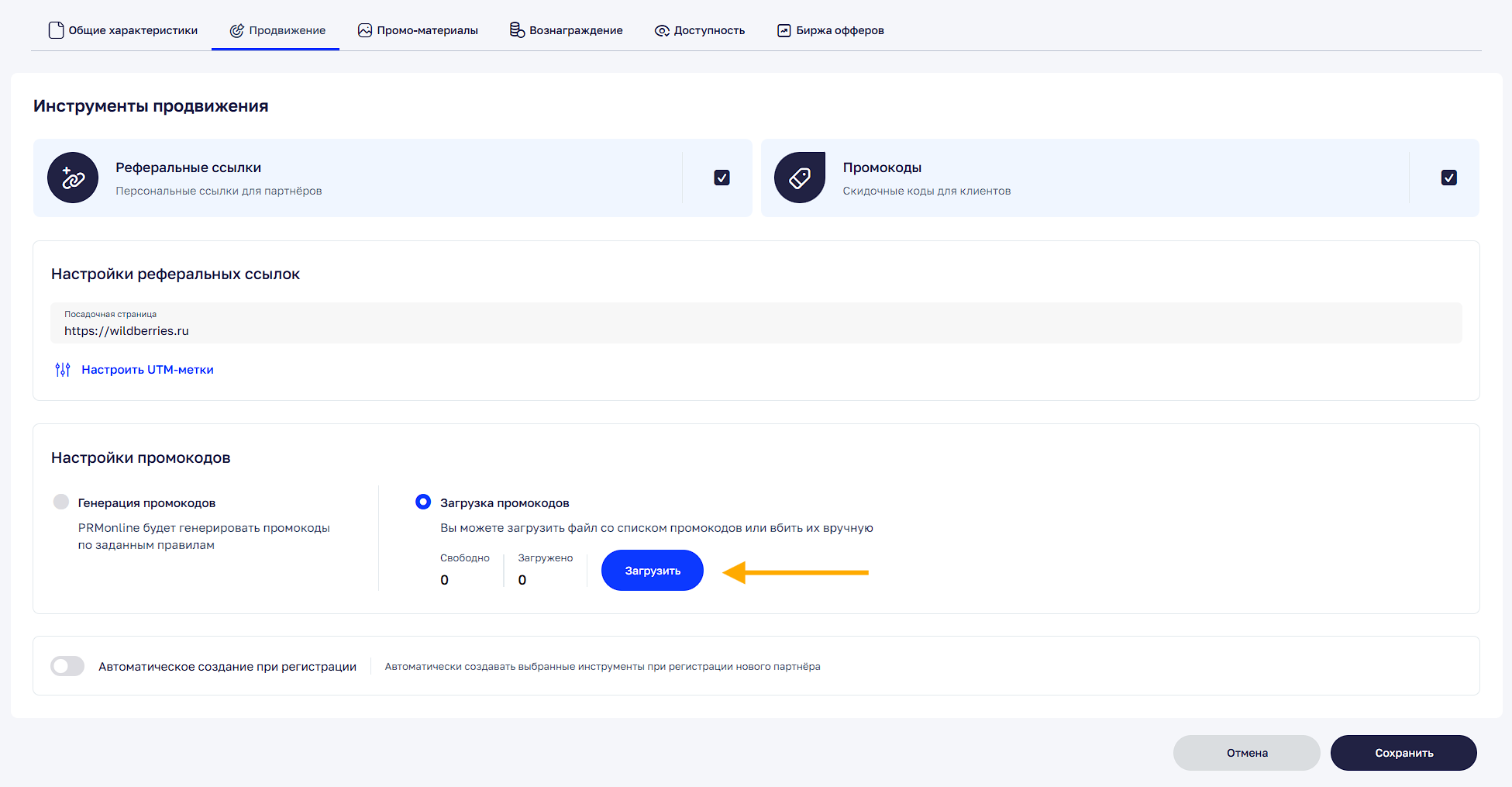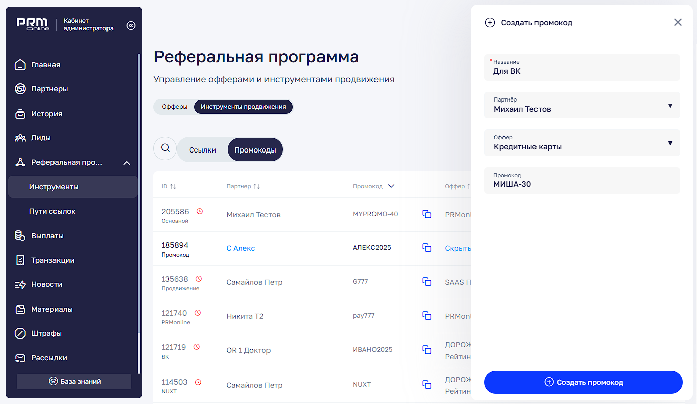 Реферальная программа → Инструменты продвижения → Промокоды