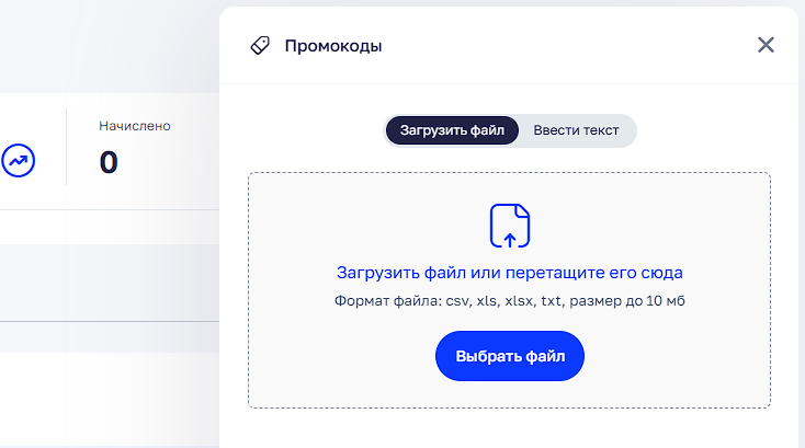 Промокоды можно загрузить из заранее подготовленного файла или вставить списком вручную.