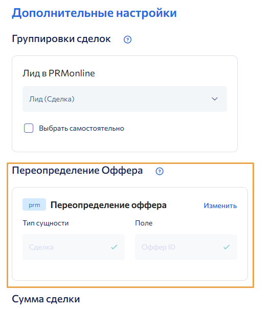 После того как поле в CRM создано и автоматическое заполнение настроено, вернитесь в настройки интеграции PRMonline и выберите это поле как источник для переопределения оффера.