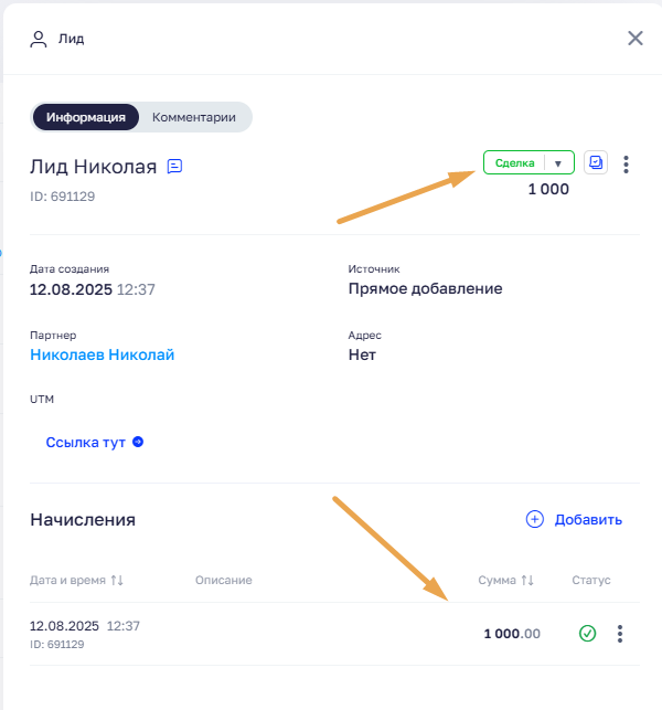 Например, партнер привел клиента по реферальной ссылке, лид был создан в системе, но окончательные параметры сделки становятся известны только позже — после общения с клиентом или после оформления заказа.
