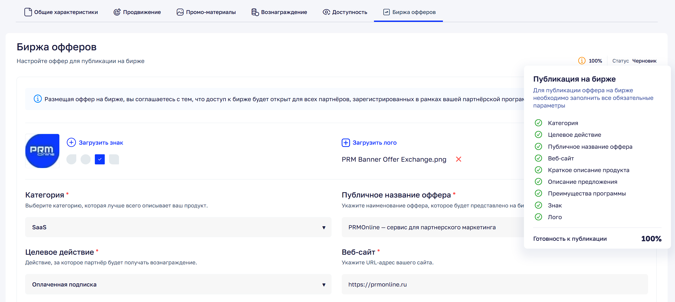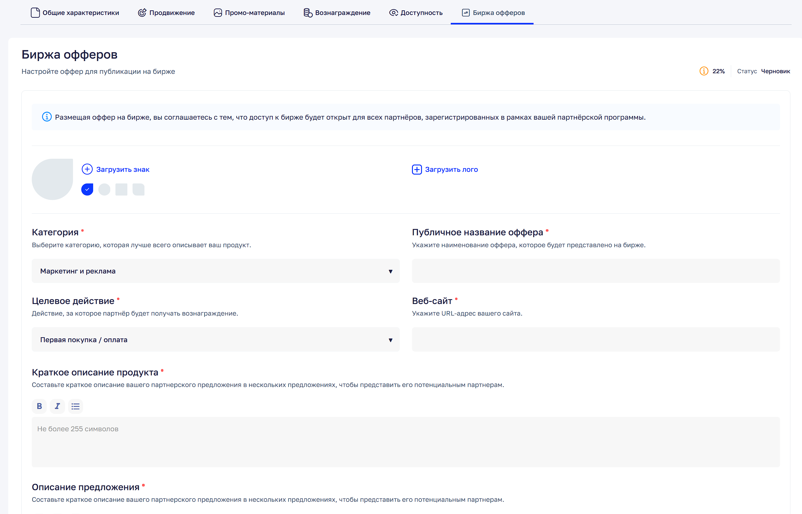 После завершения регистрации вы сможете настроить оффер для публикации, заполнить необходимые поля и опубликовать его на бирже.