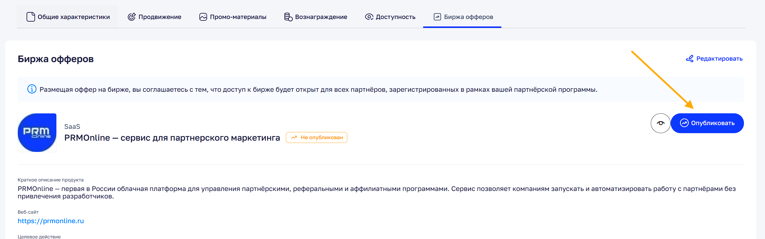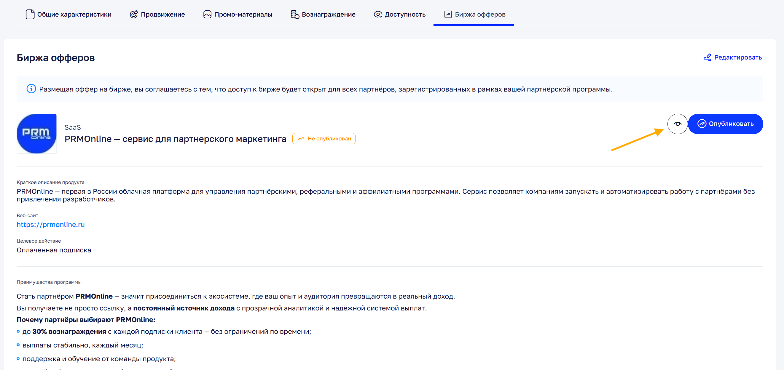 После публикации оффер становится доступен публично. Новый партнер сможет открыть его на бирже, нажать кнопку «Присоединиться», зарегистрироваться в вашем кабинете PRMonline и получить доступ к вашей партнерской программе.