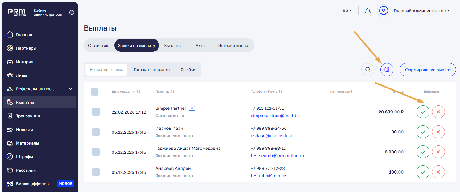 Если в системе есть сформированные заявки на выплату, они отображаются в интерфейсе администратора в разделе «Выплаты» → «Заявки на выплату».