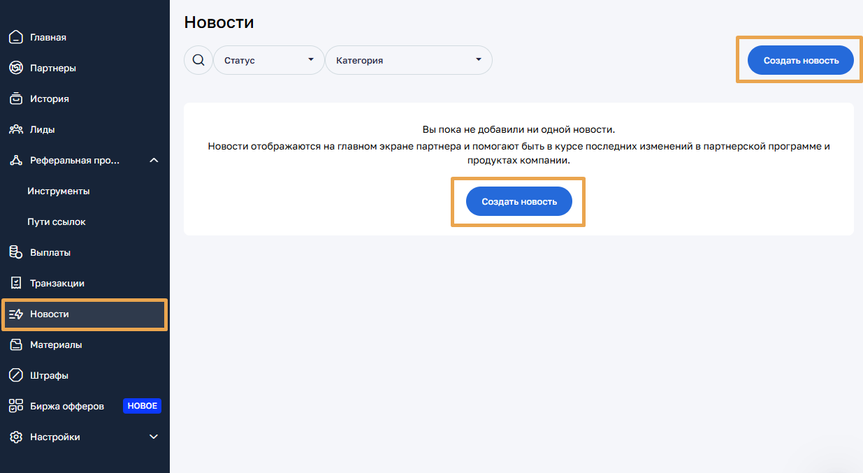 В открывшемся окне, заполните все необходимые поля, выберите категорию, добавьте описание, настройте статусы партнеров, которым будет видна новость, добавьте изображение, как показано на скриншоте ниже.