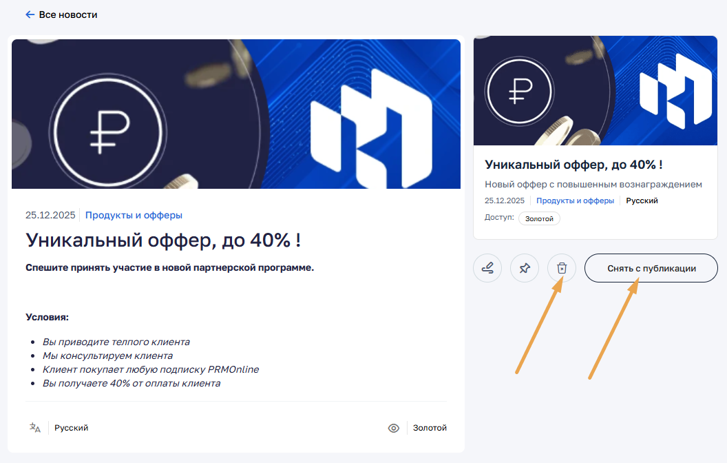 В этом случае новость перестанет отображаться в кабинете партнера, но останется доступной в кабинете администратора.