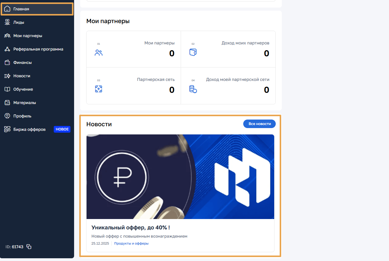 В кабинете партнера новости доступны в нескольких местах: