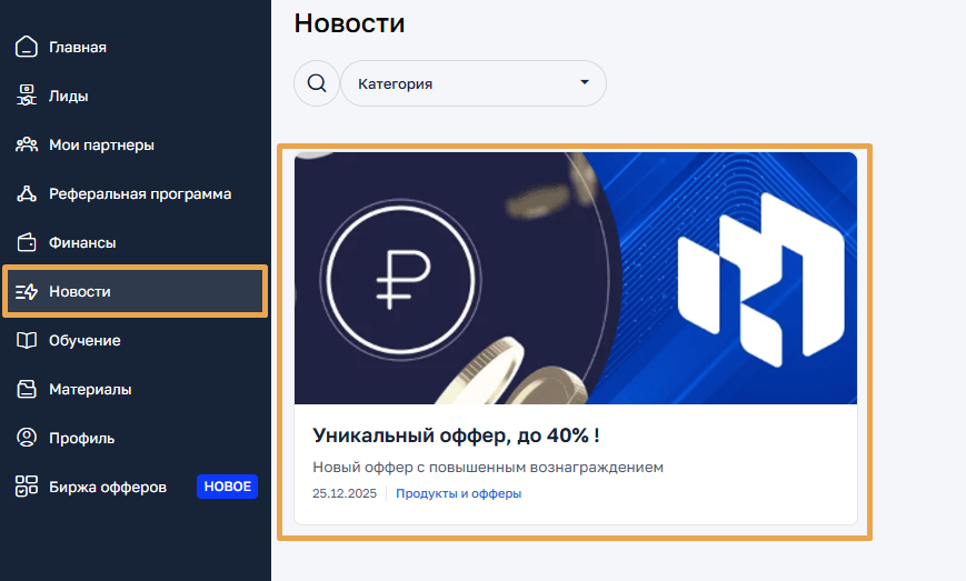 Функционал «Новости» позволяет публиковать для партнеров анонсы, уведомления о важных изменениях, информацию о новых продуктах и другие сообщения.