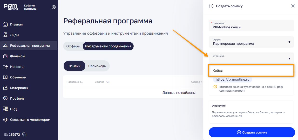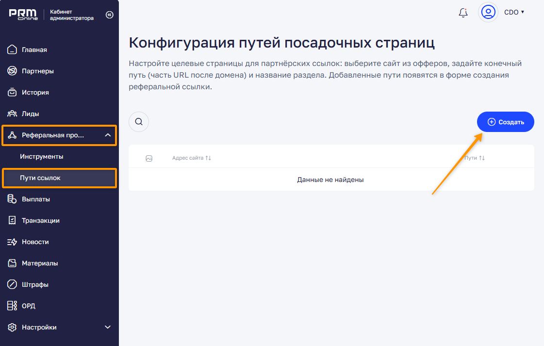 В кабинете администратора PRMonline перейдите в раздел Реферальная программа → Пути ссылок.