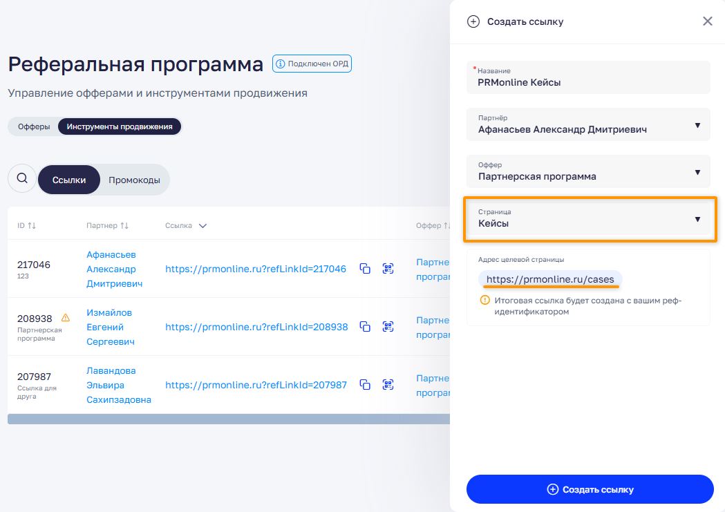 Если для оффера настроены пути ссылок, партнер увидит дополнительный параметр при генерации ссылки в своем кабинете.