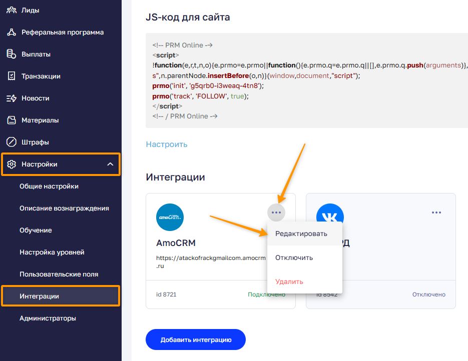 Чтобы открыть настройки интеграции в личном кабинете администратора перейдите в раздел Настройки → Интеграции → Bitrix24/AmoCRM→ (три точки) → Редактировать