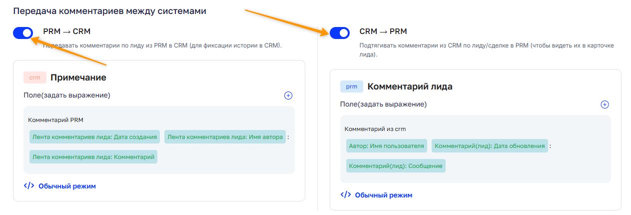 Этот блок настроек позволяет настроить автоматическую передачу комментариев из лидов и сделок в обоих направлениях.