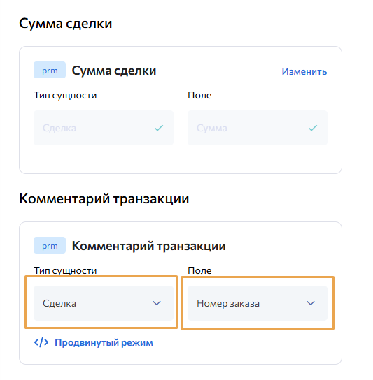 Выберите поле в CRM, из которого будут передаваться данные в Комментарий транзакции в PRM