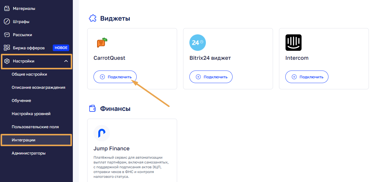 В личном кабинете Carrot Quest перейдите в раздел: