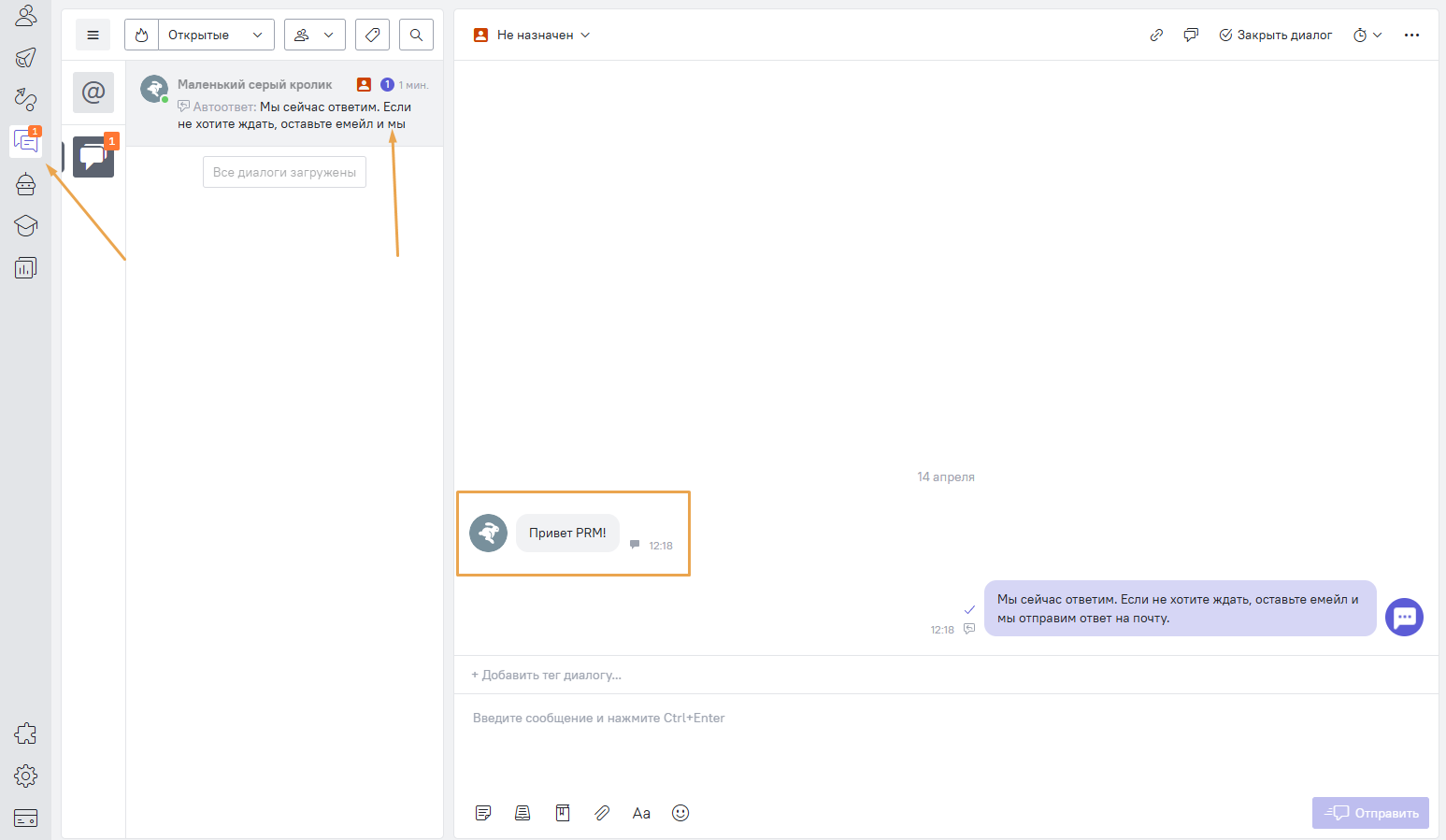 Отправьте тестовое сообщение и проверьте, что в кабинете Carrot Quest появился новый диалог.