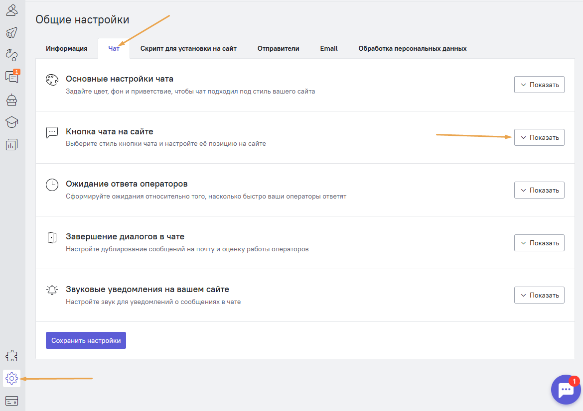 Общие настройки → Чат → Кнопка чата на сайте