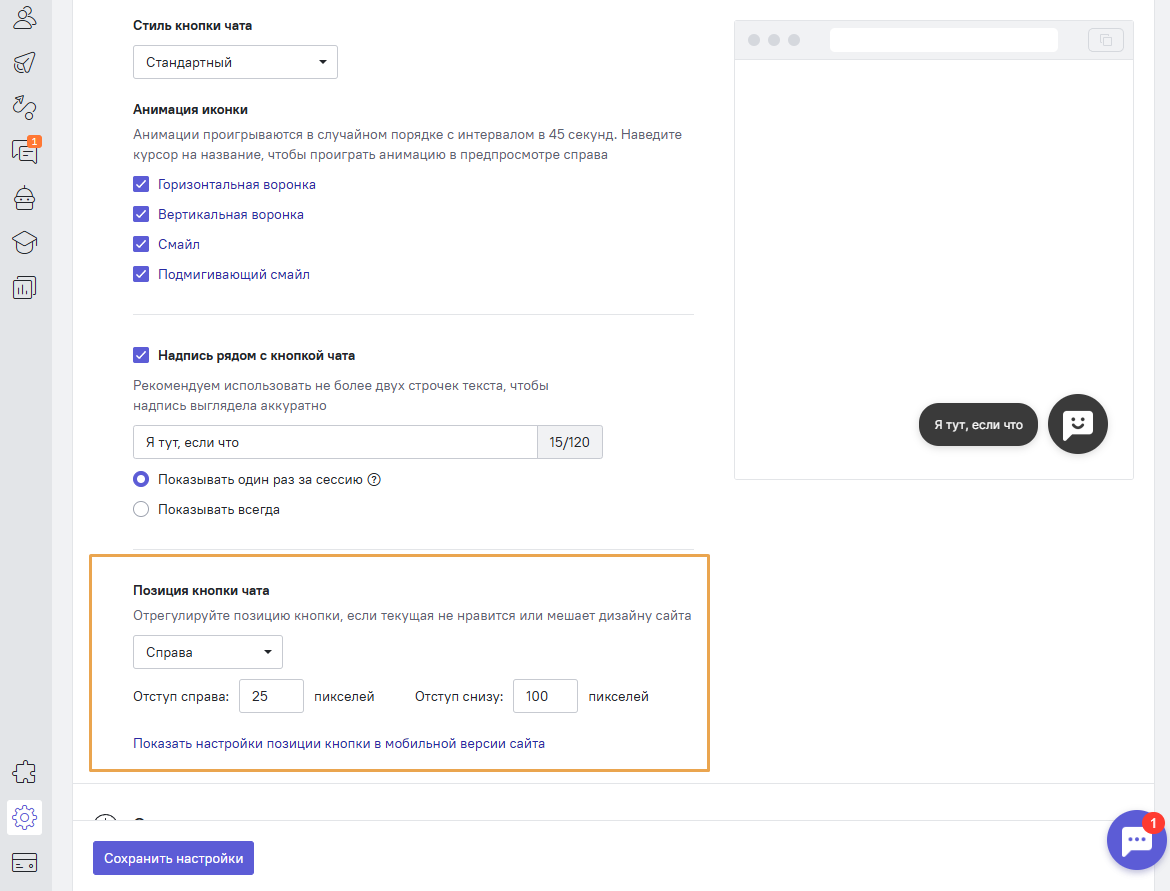 В блоке «Позиция кнопки чата» задайте нужные параметры расположения и нажмите «Сохранить настройки».