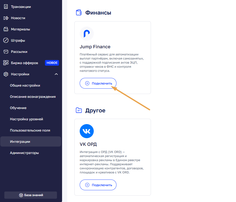 Прокрутите страницу до блока «Финансы», найдите Jump.Finance и нажмите «Подключить».