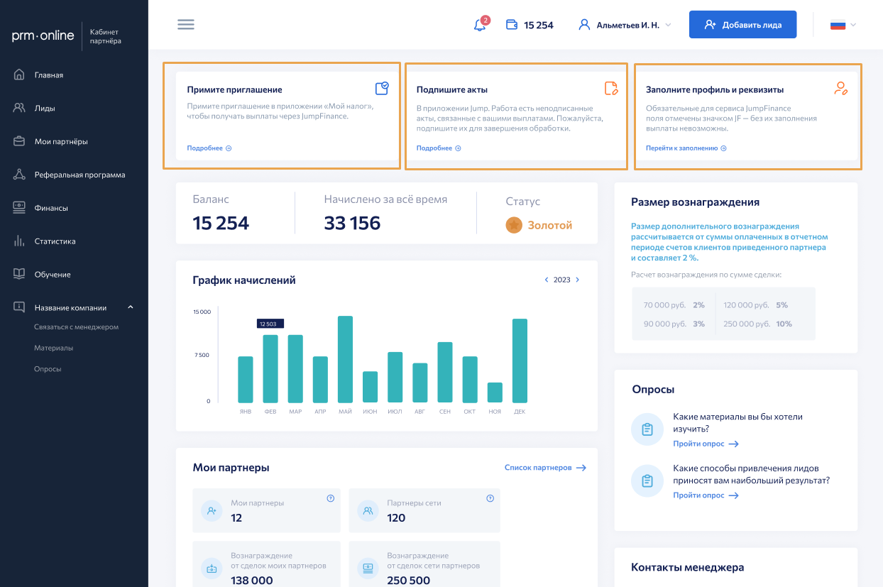 Интеграция с Jump.Finance позволяет автоматизировать ключевые процессы, связанные с выплатами партнёрам — самозанятым и индивидуальным предпринимателям (ИП).