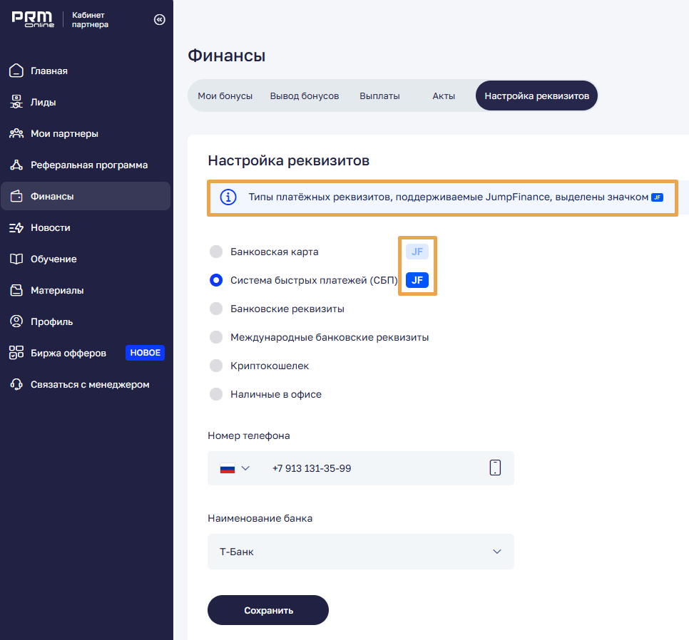 Jump.Finance в кабинете партнера