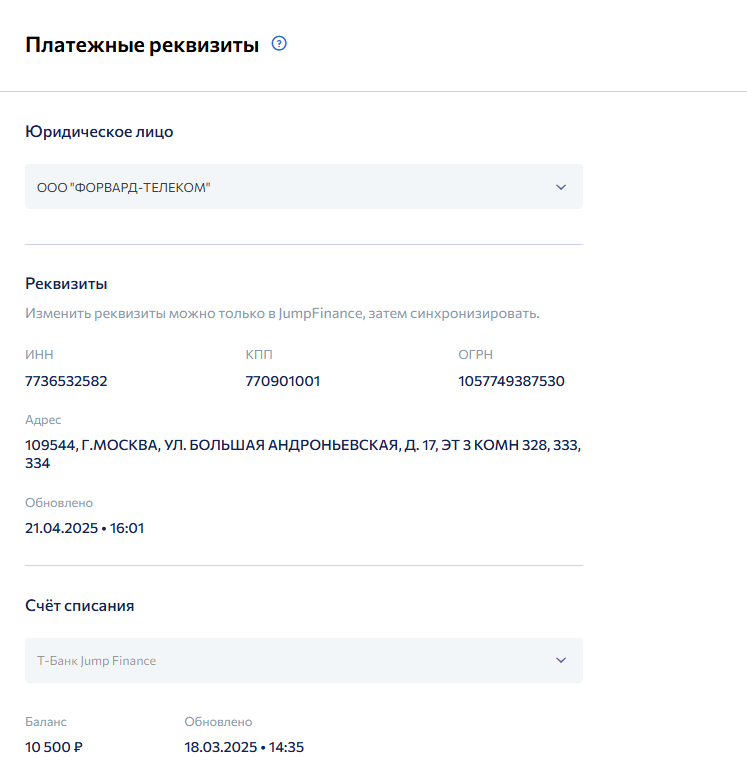 В течение одного рабочего дня с вами свяжется представитель Jump.Finance для организации подключения. При необходимости они также помогут с открытием расчётного счёта в Т-банке, если он ещё не открыт.