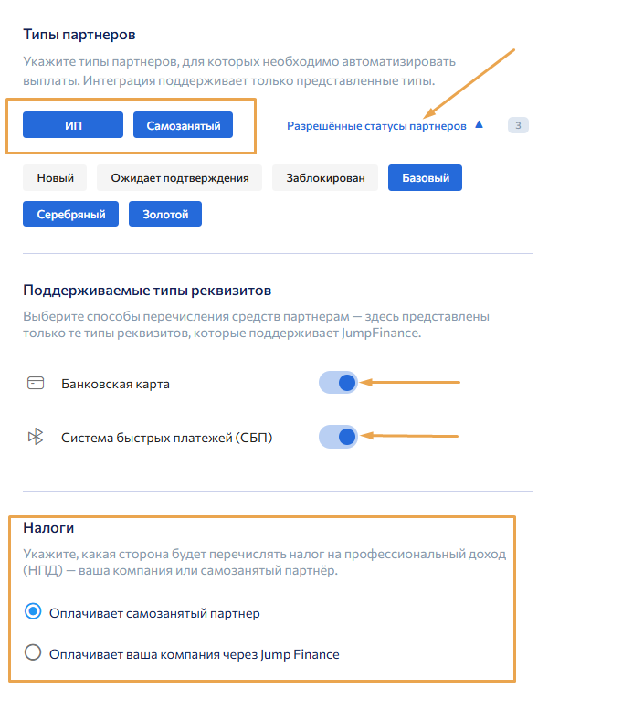 Чтобы интеграция в дальнейшем работала корректно, необходимо заранее проверить, что в настройках JF включены все необходимые типы партнёров. Подробнее об этом — в базе знаний JF.
