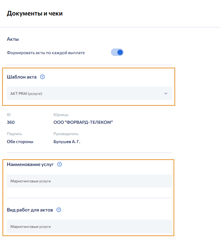 На следующем шаге активируйте переключатель Формировать акты по каждой выплате.