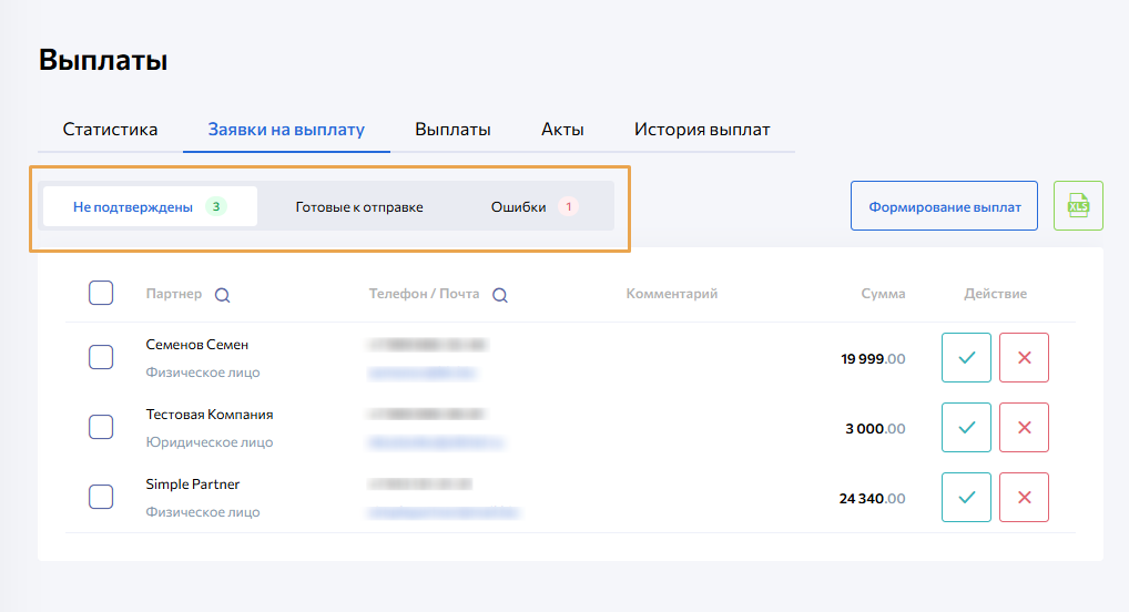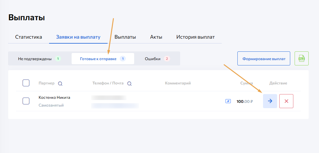 Во вкладке Готовые к отправке можно инициировать процесс расчета с партнером, отправив заявку на выплату в JF, или отменить заявку.