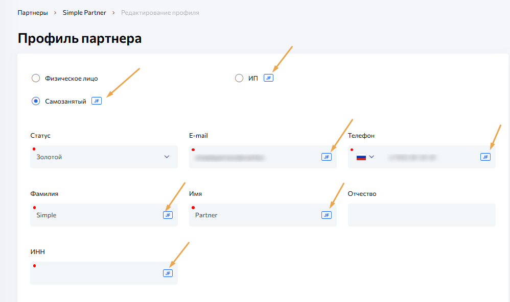 При создании партнера, на доступных для интеграции типах партнера, и в полях, которые обязательны для отправки партнера в JF появится соответствующий значок.