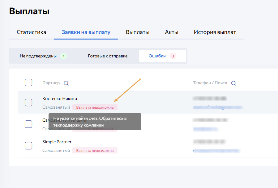 Во вкладе Ошибки, если навести на кнопку Выплата невозможна можно увидеть, что нужно исправить для устранения ошибки.