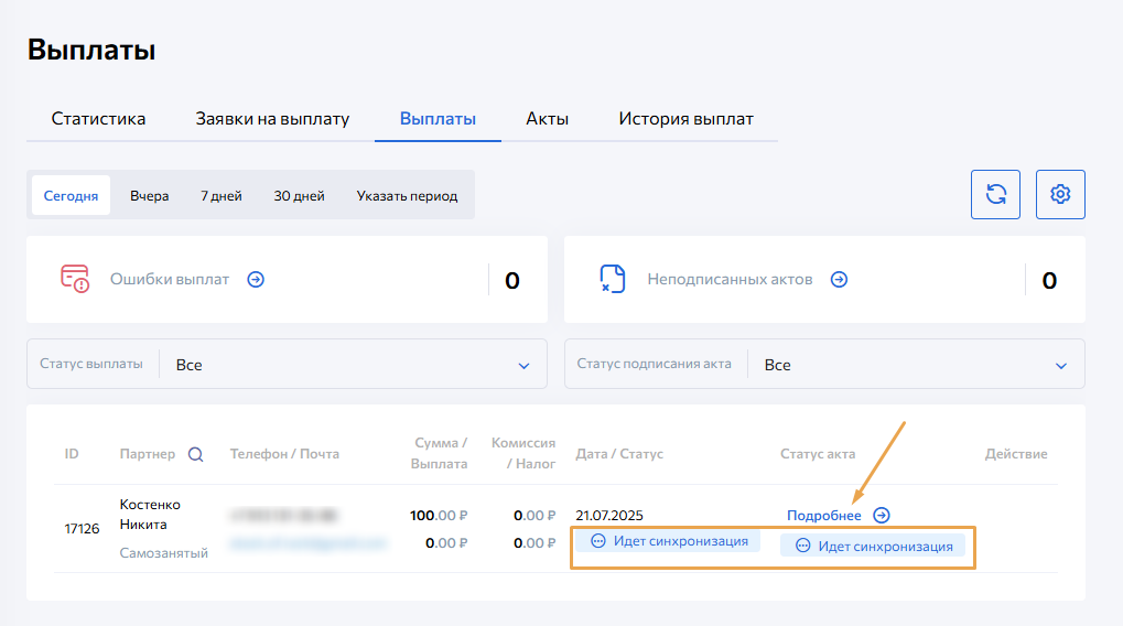 Также после отправки выплаты в JF, во вкладке Акты появится информация о статусе синхронизации акта с кабинетом JF, о статусе подписания акта сторонами с помощью ЭЦП.