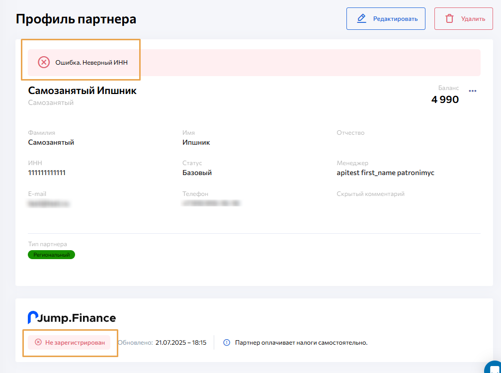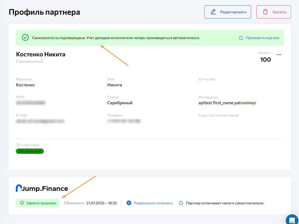 После создания, в профиле партнера можно увидеть статус синхронизации с JF, а также подтверждение юридического статуса.