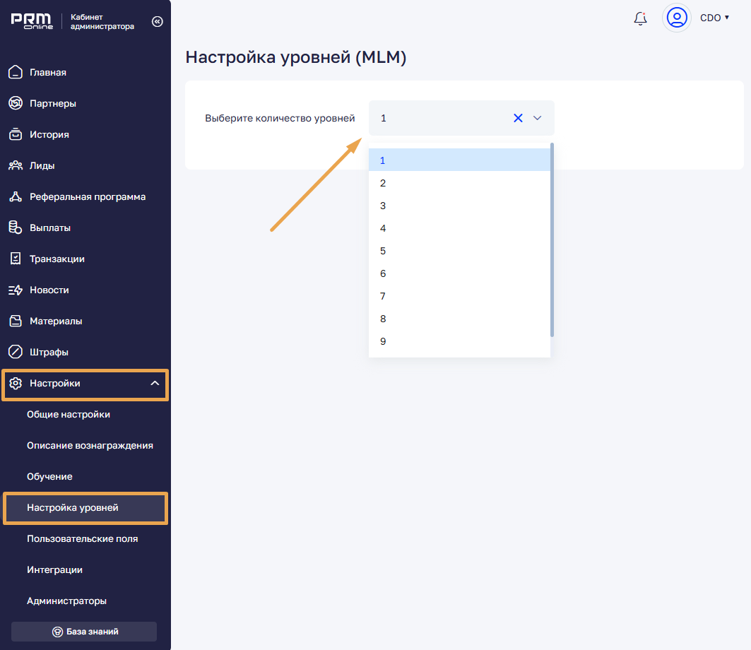 Выберите необходимое количество уровней партнерской программы, в соответствии с вашим бизнес-процессом. Максимально доступно 10 уровней.