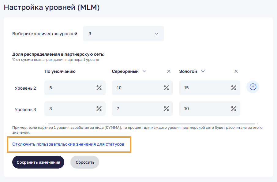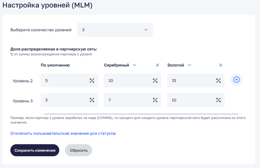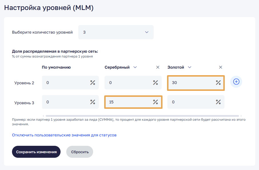 По кнопке "Настроить для разных статусов" можно переопределять процент вознаграждения в зависимости от статуса партнера.