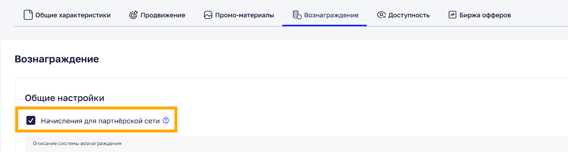Чтобы вознаграждение по многоуровневой программе рассчитывалось корректно, в настройках оффера в блоке вознаграждения должна быть включена опция «Начисления по партнерской сети (MLM)».