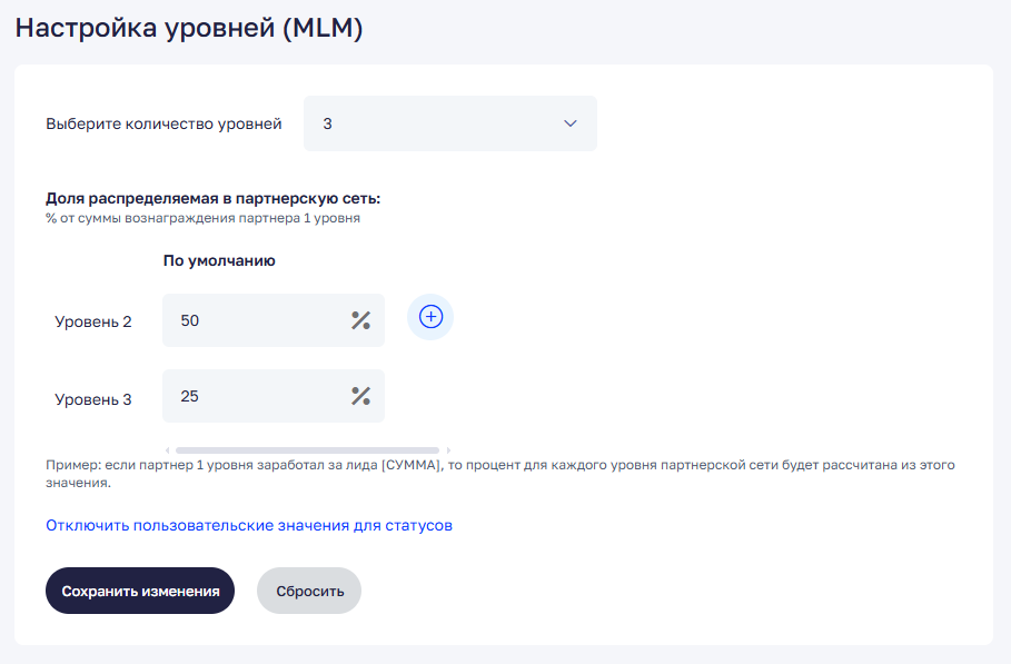 Многоуровневая программа (MLM) позволяет распределять вознаграждение по партнерской сети в зависимости от уровня партнера и, при необходимости, его статуса.