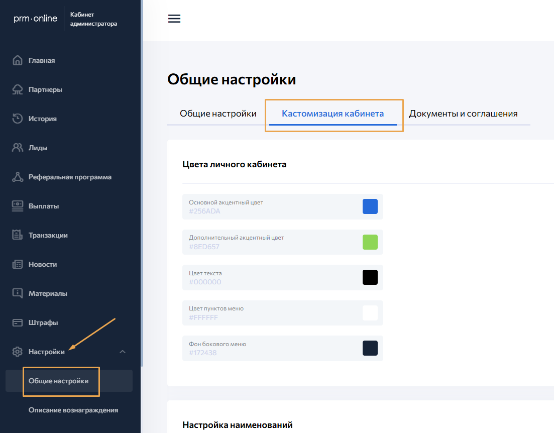 Кастомизация позволяет настроить внешний вид кабинета под ваш бренд: изменить цвета интерфейса, названия отдельных элементов и логотипы. Это помогает сделать работу партнеров внутри системы более бесшовной с точки зрения пользовательского опыта.