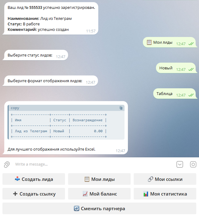 Быстрая регистрация лидов: Позволяет легко регистрировать партнерам новых лидов прямо через Telegram.