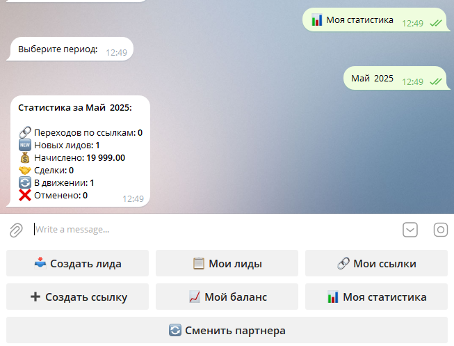 Бот отобразит статистику по основным показателям: переходы, лиды, начисления и статусы.
