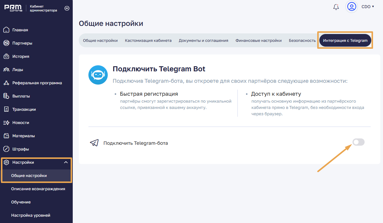 Чтобы подключить Telegram-бота для вашего аккаунту PRMOnline, перейдите в Настройки → Общие настройки → Интеграция с Telegramи включите переключатель напротив пункта «Подключить Telegram-бота».
