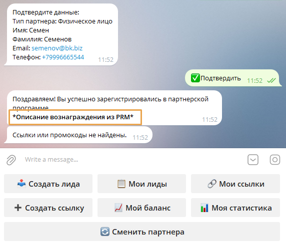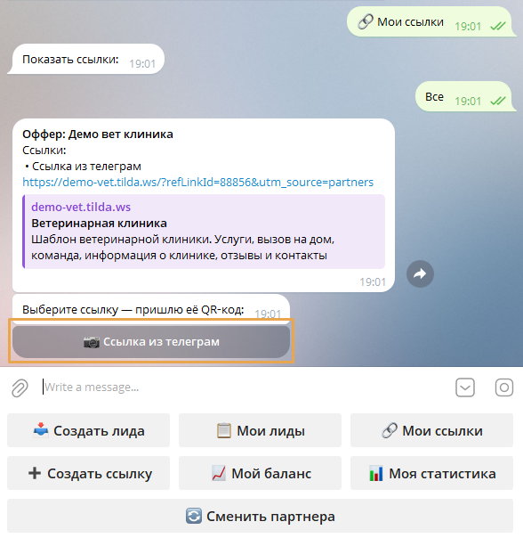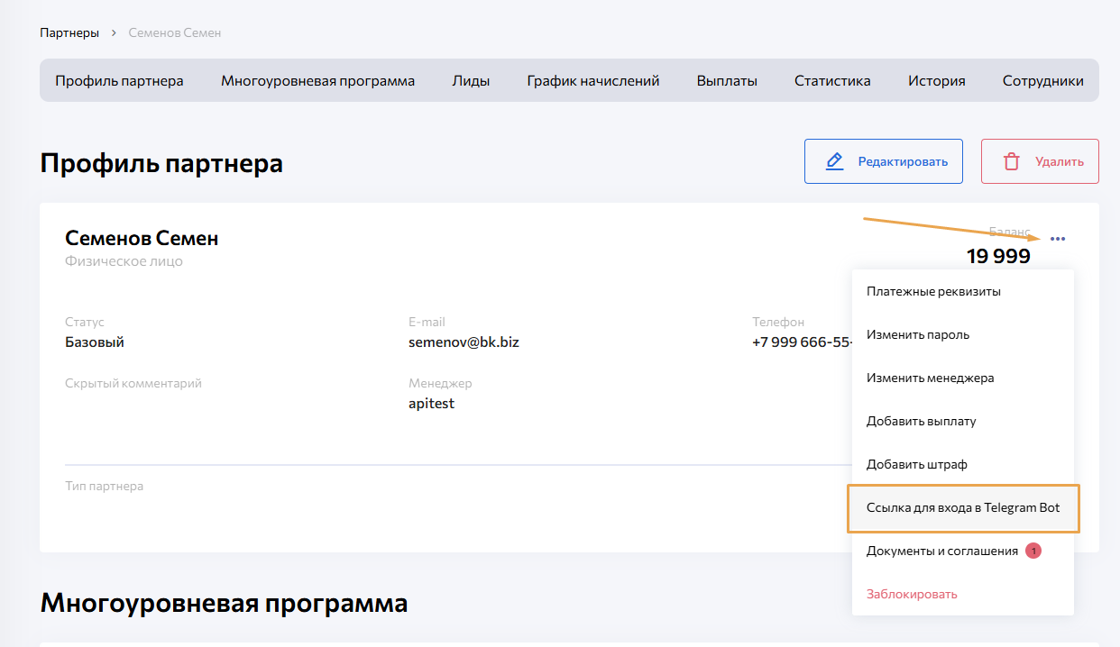 Если партнёр уже зарегистрирован, ссылка для входа в Telegram-бот будет доступна в его профиле.
