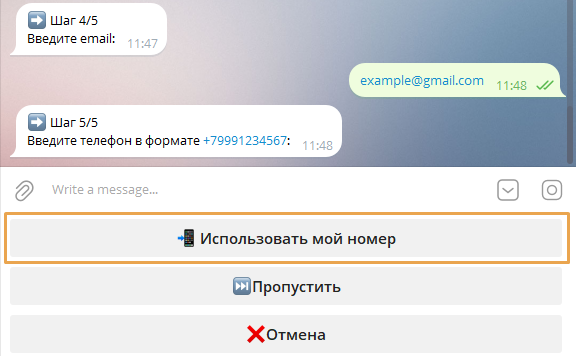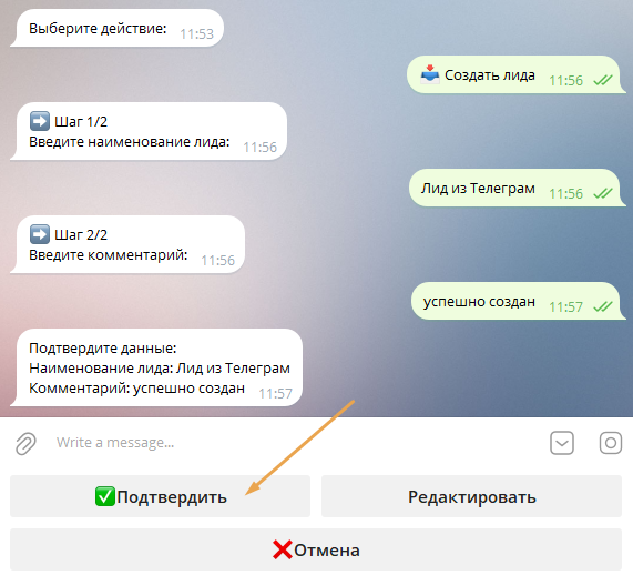 Бот запустит пошаговый процесс — аналогичный созданию лида в личном кабинете.