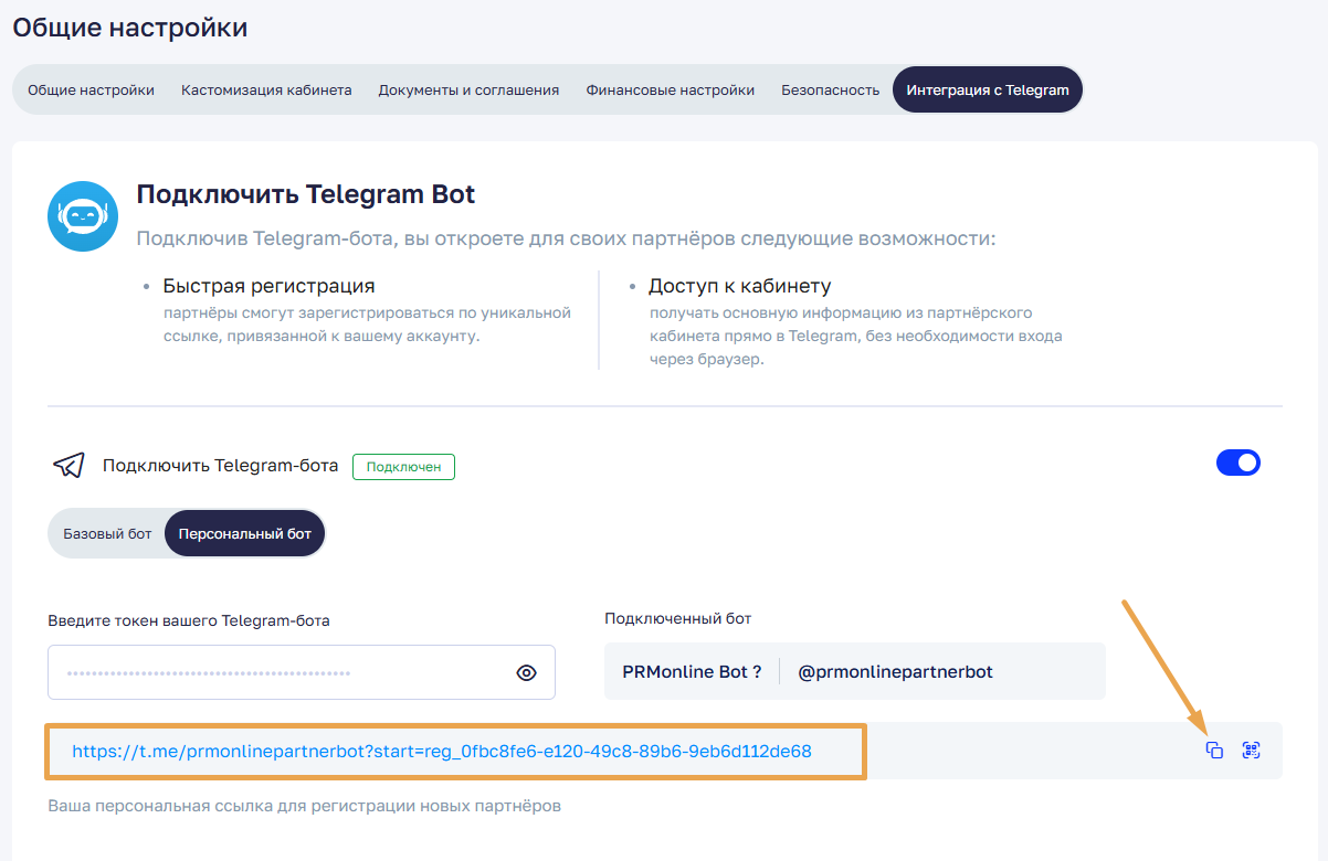 Скопируйте ссылку или QR-код во вкладке «Интеграция с Telegram» в разделе общих настроек и отправьте партнёру через любой удобный канал связи.