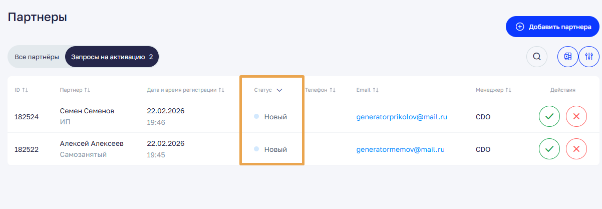 Новый партнёр также отобразится в вашем аккаунте PRMOnline — в разделе «Партнёры», в начальном статусе, установленным в настройках вашего аккаунта.
