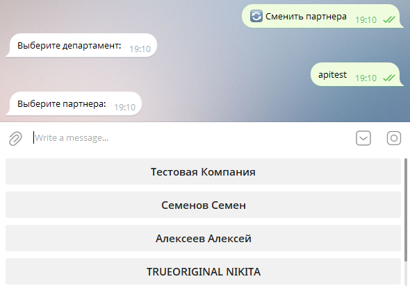 При нажатии бот сначала предложит выбрать департамент —то есть название вашего бренда, под которым зарегистрирован аккаунт в PRMOnline.