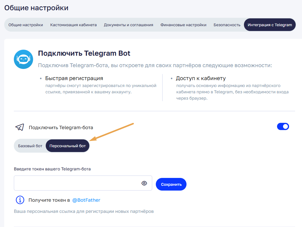 Чтобы подключить вашего Telegram-бота, переключите вкладку на "Персональный бот".