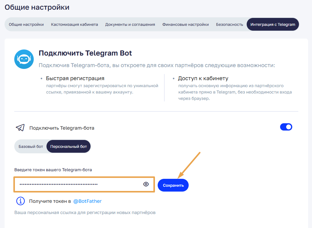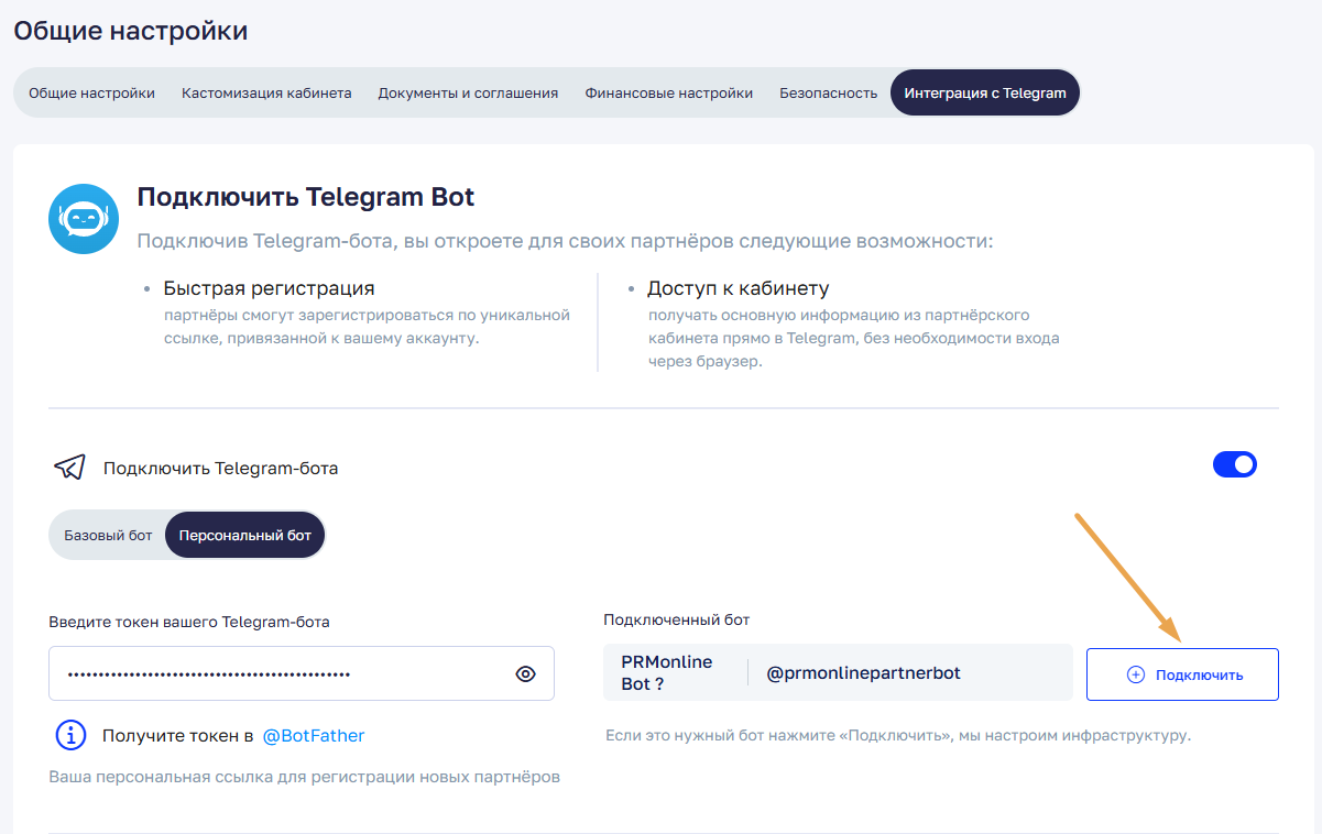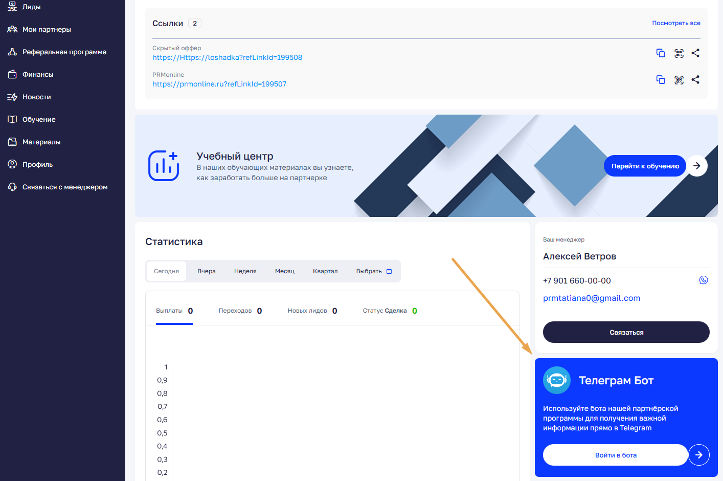 В кабинете партнера ссылка на Telegram-бот доступна на главном дашборде.