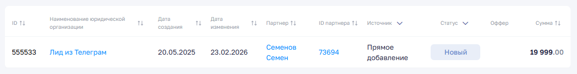 Ниже — пример, как будет выглядеть созданный лид в интерфейсе PRMOnline.