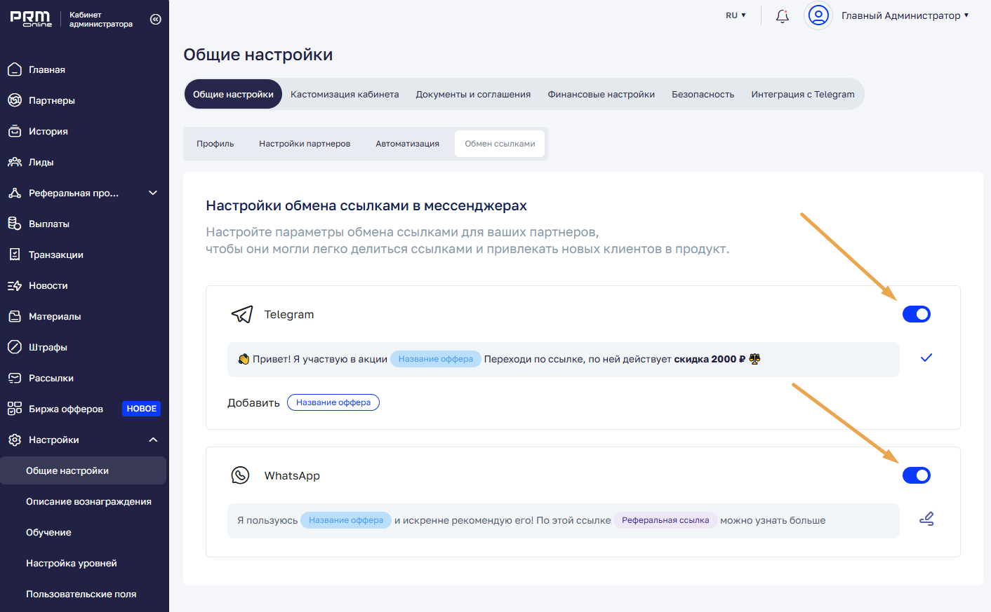 Чтобы включить функцию, в личном кабинете администратора перейдите в раздел Настройки → Общие настройки → Обмен ссылками.